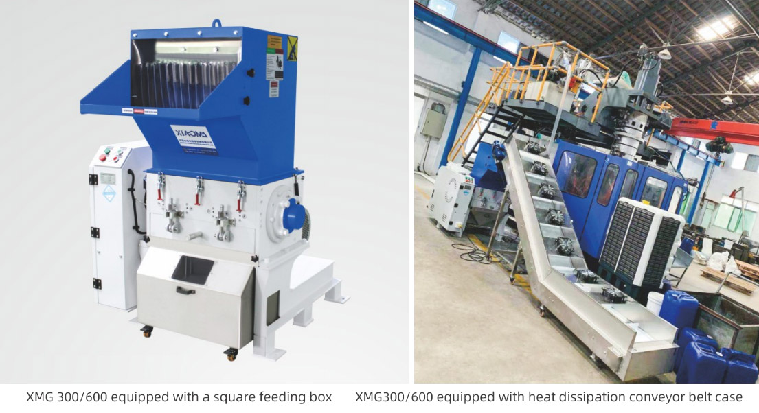 ■ XIAOMA production of medium-sized cusher XMG 300/400 and XMG 300/600 series, in addition to the advantages XMG180 series crusher, but more suitable for crushing blow molded plastic bottiles and other products, such as hollow material, and its unique design stepped tum knife arranged in V-shaped, so that it can grasp the necessary cushing cushed matenial in the central chamber, can be Preventing material attached to the side wall of the crushing chamber, the stepped design of the rotor so that the machine is in the crushed material, at any time only a tool during outting, thereby increasing the cutting machine's torque.